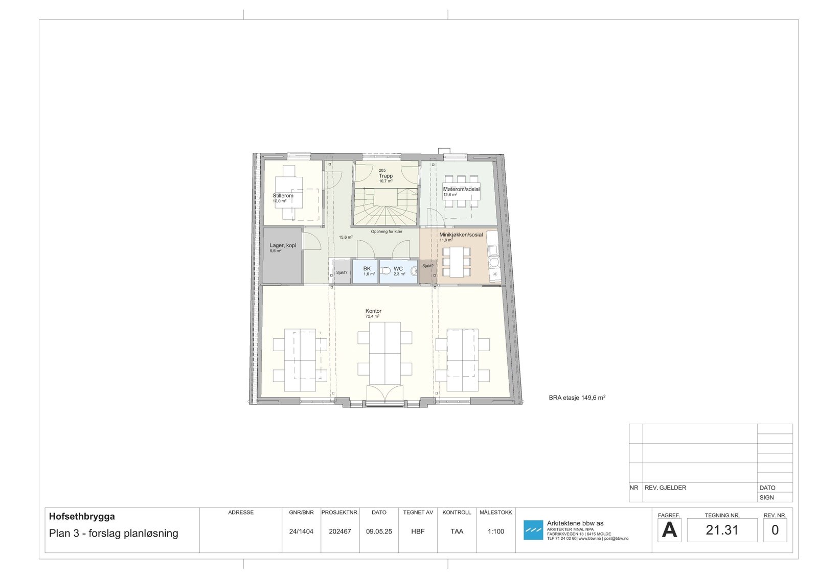 Historiske Hofsethbrygga er ferdig rehabilitert og alt er nå klart for å tilpasse bygget til ny leietaker innvendig. Her har du muligheten til å få et helt eget bygg spesialtilpasset for din bedrift. Ta kontakt med eiendomssjef for ytterligere informasjon og visning.  Hofsethbrygga vil være ideelt for en kontorleietaker som er på jakt etter et unikt lokale og som ønsker seg sitt helt eget hus for bedriften. Eiendommen ligger på bryggekanten midt i Molde sentrum og består av tre etasjer hvor det er tegnet inn 24 faste arbeidsplasser pluss stillerom, møterom og prosjektrom. Det er i tillegg kjøkken, sosiale soner, oppheng for klær og wc samt kopirom/ lager. Planløsningen som er tegnet er et forslag, lokalet kan bygges etter leietakers behov og ønsker.